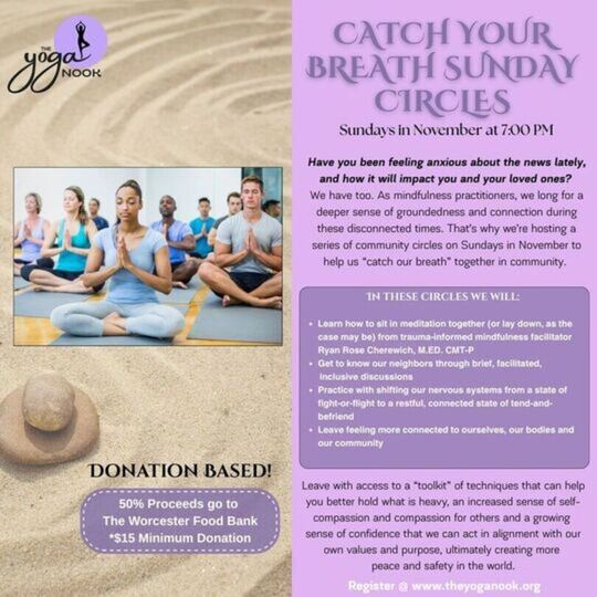 That’s why The Yoga Nook is pairing up with local Bolton resident, Ryan Rose Cherecwich to host a series of community circles on Sundays in November to help us “catch our breath” together in community. (No prior meditation/yoga experience, physical flexibility or levitating required!)